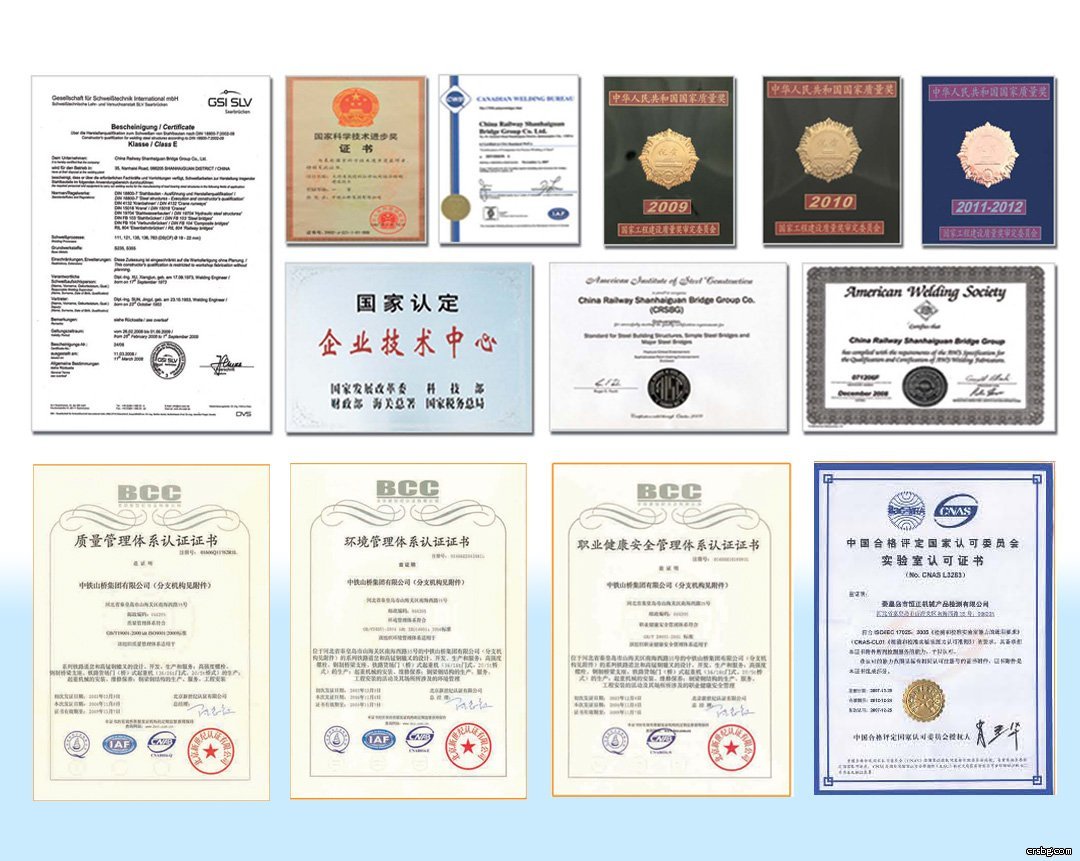 中鐵山橋被列為國家認(rèn)定企業(yè)技術(shù)中心、中國鐵道器材研究發(fā)展基地,建有博士后科研工作站。擁有鋼結(jié)構(gòu)工程專業(yè)承包一級(jí)資質(zhì)、鋼結(jié)構(gòu)制造特級(jí)資質(zhì)和建筑行業(yè)總承包二級(jí)資質(zhì)。通過了ISO9001質(zhì)量體系認(rèn)證、ISO14001環(huán)境管理體系認(rèn)證、GB/T28001職業(yè)健康安全管理體系認(rèn)證、英國UKAS認(rèn)證、美國鋼結(jié)構(gòu)認(rèn)證、AWS焊接認(rèn)證、AAR道岔認(rèn)證、歐盟TSI道岔認(rèn)證、德國焊接認(rèn)證、加拿大焊接認(rèn)證和北歐鐵路合格供應(yīng)商認(rèn)證。