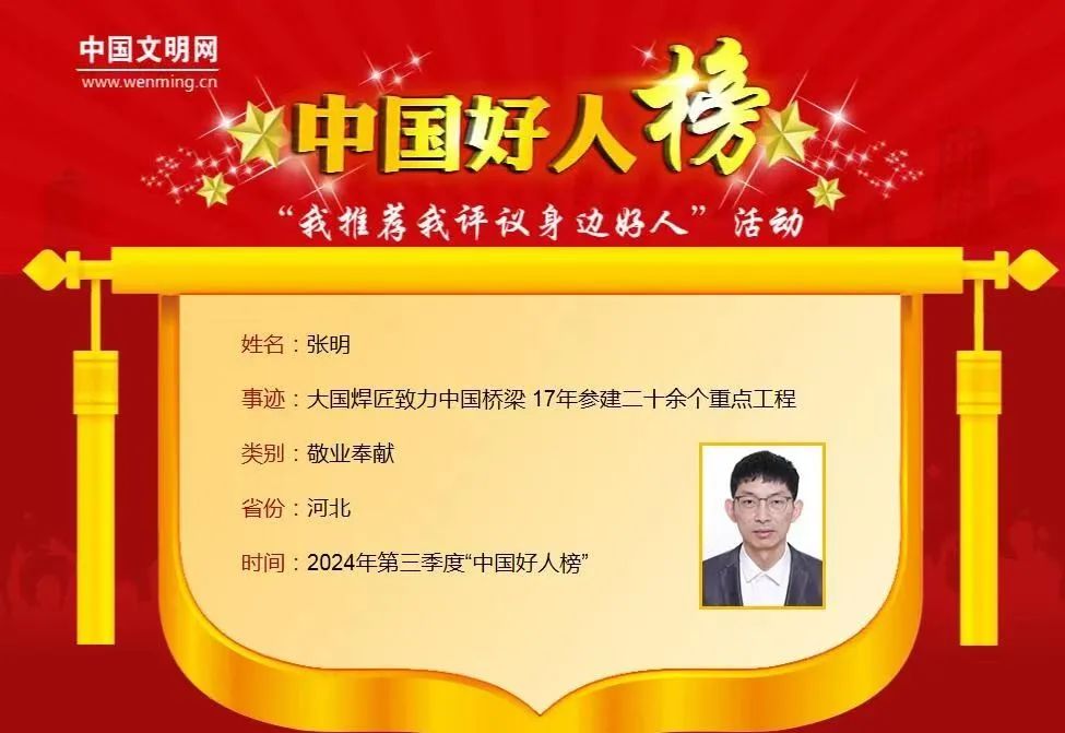 11月12日,中央精神文明建設辦公室主辦的2024年第三季度“中國好人榜”公布,中鐵山橋焊接特級技師張明入選2024年第三季度敬業(yè)奉獻“中國好人榜”榜單。